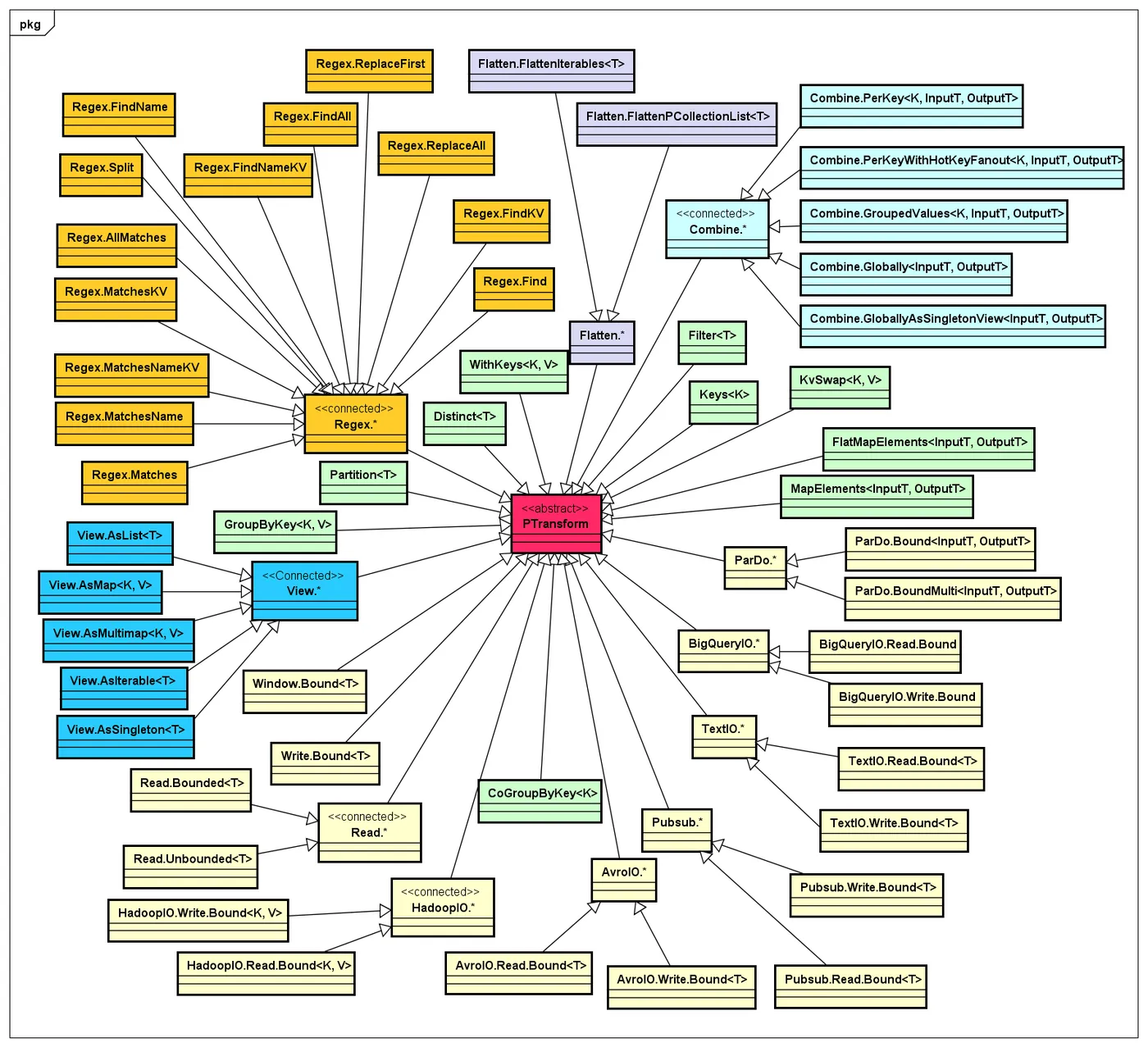 一个Pipeline是由一个或多个PTransform构建而成的DAG图,其中每一个PTransform都具有输入和输出,所以PTransform是Apache Beam中非常核心的组件,我按照PTransform的做了一下分类,如下类图所示: