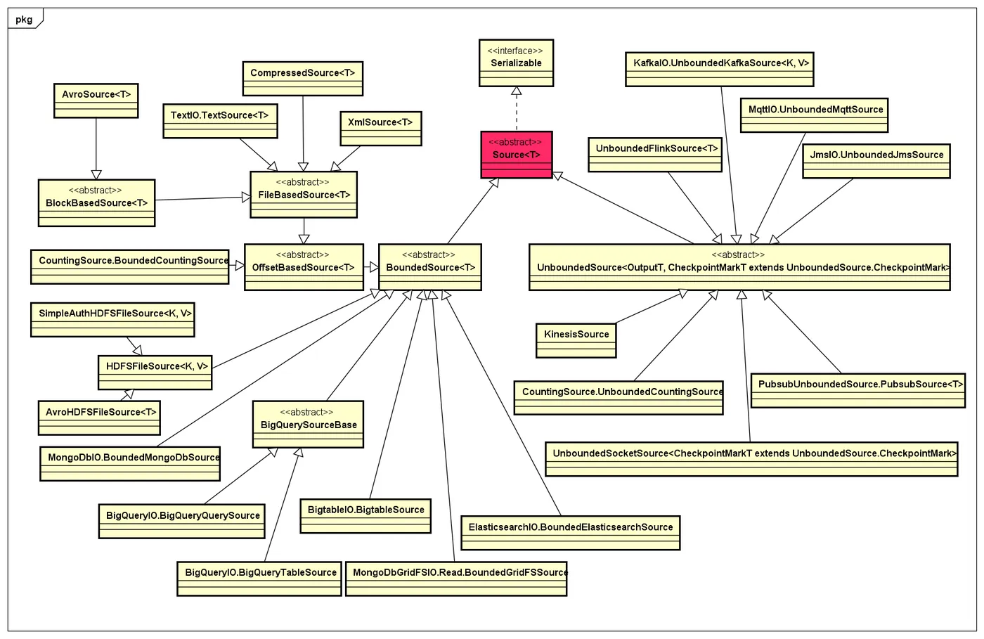Source表示数据输入的抽象,在API定义上分成两大类:一类是面向数据批处理的,称为BoundedSource,它能够从输入的数据集读取有限的数据记录,知道数据具有有限性的特点,从而能够对输入数据进行切分,分成一定大小的分片,进而实现数据的并行处理;另一类是面向数据流处理的,称为UnboundedSource,它所表示的数据是连续不断地进行输入,从而能够实现支持流式数据所特有的一些操作,如Checkpointing、Watermarks等。