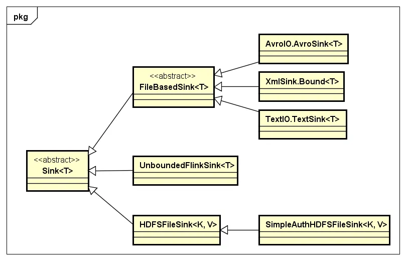 Sink表示任何经过Pipeline中一个或多个PTransform处理过的PCollection,最终会输出到特定的存储中。与Source对应,其实Sink主要也是具有两种类型:一种是直接写入特定存储的Bounded类型,如文件系统;另一种是写入具有Unbounded特性的存储或系统中,如Flink。在API设计上,Sink的类图如下所示: