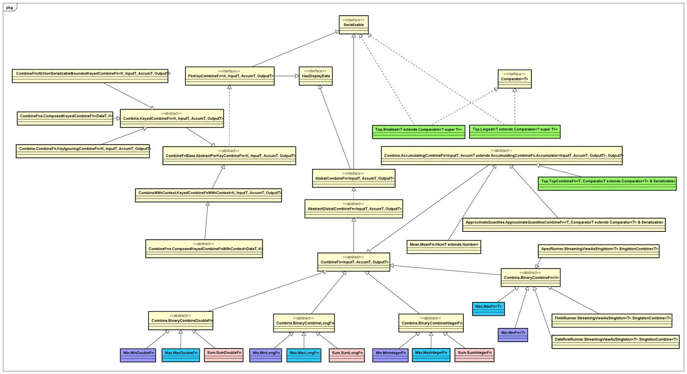这里,单独把Combine这类合并数据集的实现拿出来,它的抽象很有趣,主要面向globally 和per-key这两类抽象,实现了一个非常丰富的PTransform算子库,对应的类图如下所示: