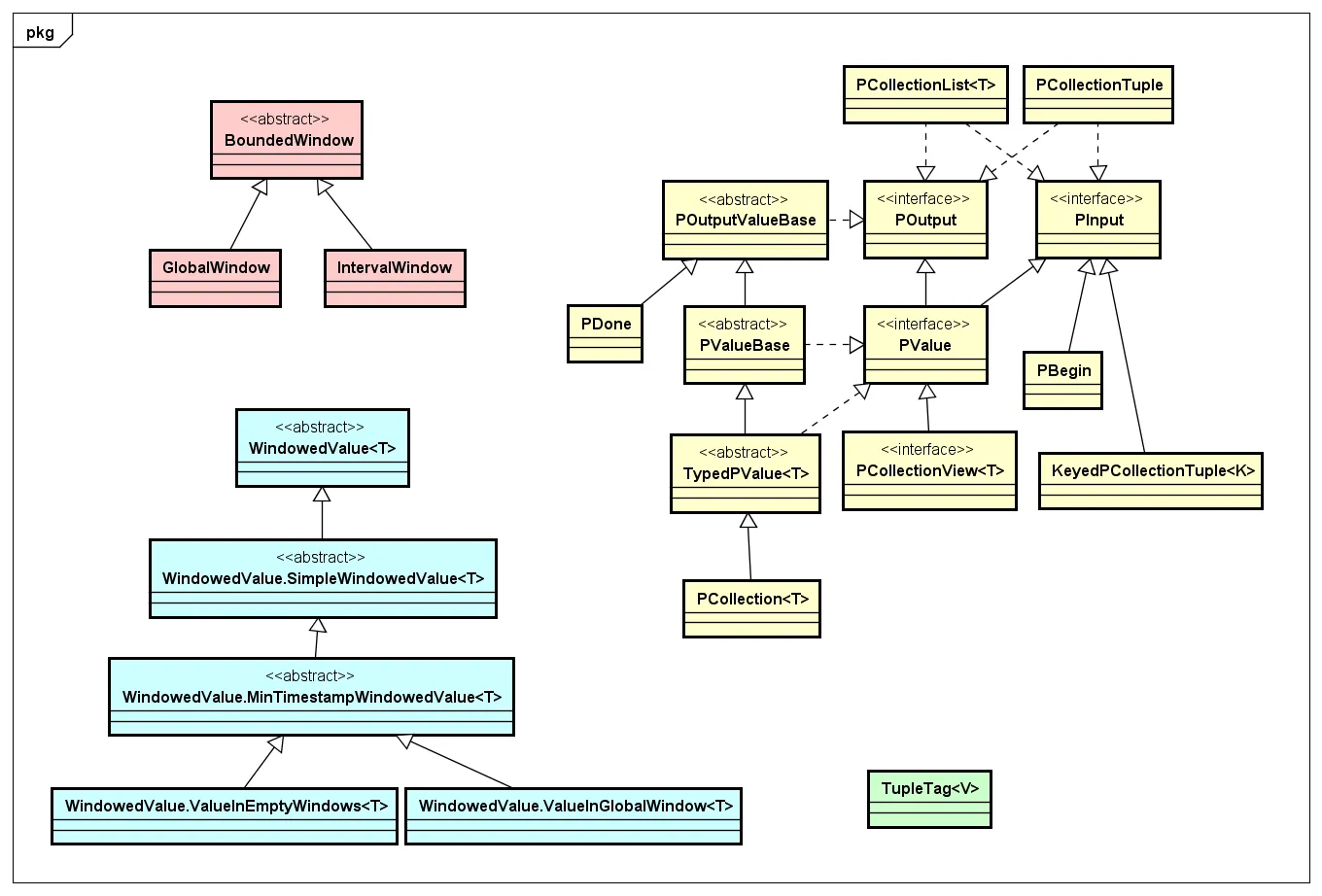 PCollection是对分布式数据集的抽象,主要用作输入、输出、中间结果集。其中,在Apache Beam中对数据及其数据集的抽象有几类,我们画到一张类图上,如下图所示: