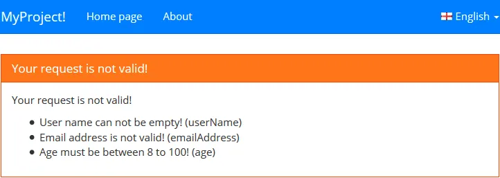 当你使用ABP的基础设施在客户端发起Ajax请求时,客户端会自动地处理这个Json对象,然后使用message API给用户提示错误信息。