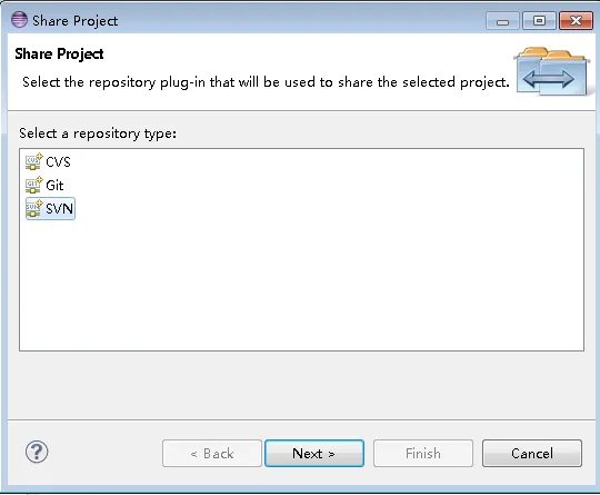 要将新的项目添加到 Subversion 存储库,请右击该项目(可以在任何 Eclipse 的项目视图或 Navigator 视图),并且从菜单中选择 Team > Share Project。Eclipse 会显示 Share Project 对话框。