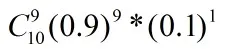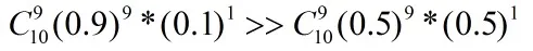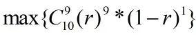 比如取 r=0.9,即抛一次硬币出现正面的概率是0.9,那么抛10次硬币出现9次正面的概率就是:
