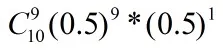 如果r=0.5的话,抛10次硬币,抛硬币是独立重复事件,服从二项分布,那么出现9次正面的概率是: