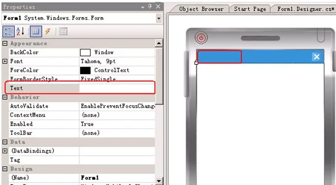 这是一种比较偷懒的方法,为什么这么说?因为我们仅仅需要在visual studio开发环境中,对Form设计进行简单的编辑,就可以实现我们的需求。闲话少说,直接上图。如图2所示,在Form设计窗口中,选中Form,查看其Properties,就可以发现有“Text”一项,这项功能是充当Form的标题,如果我们把其中的文字“Form1”去掉,在对应的设计窗口中,我们就可以发现,Form1已经不见了。