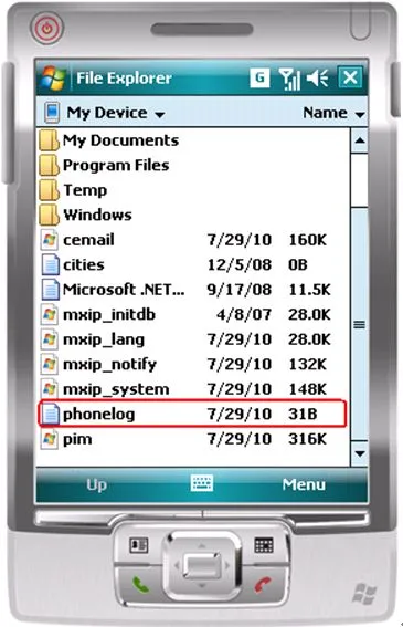 利用File Explorer,在设备的“My Device”下,我们找到了phonelog.txt文件,打开该文件,我们就可以查到刚才拨打电话的信息,如图7和图8所示。