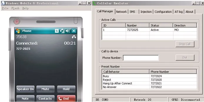 把Cellular Emulator和模拟器连接以后,在模拟器上给Cellular Emulator拨打电话,如图6所示: