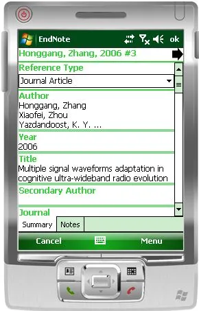 同步过程比较慢,同步结束以后,我们可以在WM设备上通过Endnote浏览文献信息了,如下图7所示: