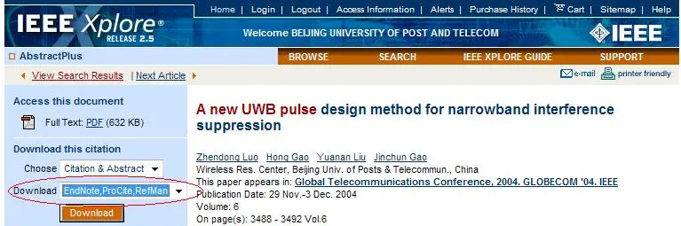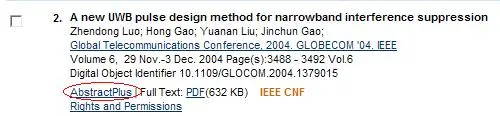 Endnote的好处就是可以下载文献的详细信息,如作者、摘要、关键词等等信息。以IEEE数据库为例,我们可以在IEEE Xplore上找到相关的文献以后,将其下载到Endnote里面。如下图2所示,我们找到需要的文献以后,点击AbstractPlus;