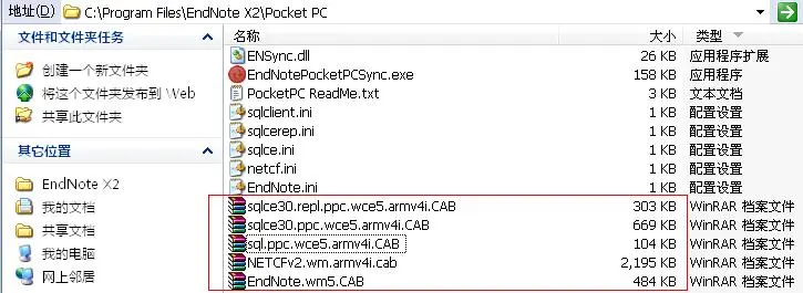 WM版本的Endnote只是适合WM5.0以后的版本,而且只支持Pocket PC,不包括Smartphone。它是基于.NET CF2.0的,所以在安装Endnote for WM之前,会先安装.NET CF2.0,当然还有Microsoft SQL Mobile 2005和Microsoft SQL Client之类的安装包。安装过程没有什么特殊的操作,只要在PC上安装Endnote以后,选择在WM上安装就可以,等到下一次通过ActiveSync连接设备时,以上的安装包就会自动安装,只要选择安装在Device或者是Storage Card就可以。其实,要自己装也是可以,就是麻烦点,将” C:\Program Files\EndNote X2\Pocket PC”目录下的几个cab安装包(如下图1所示)拷贝到设备上,一个个的安装就行。