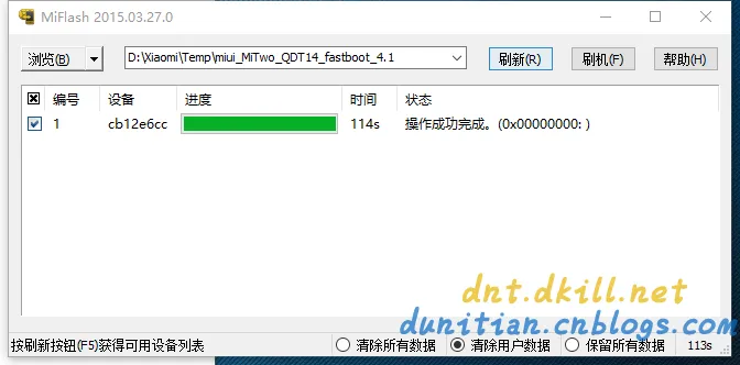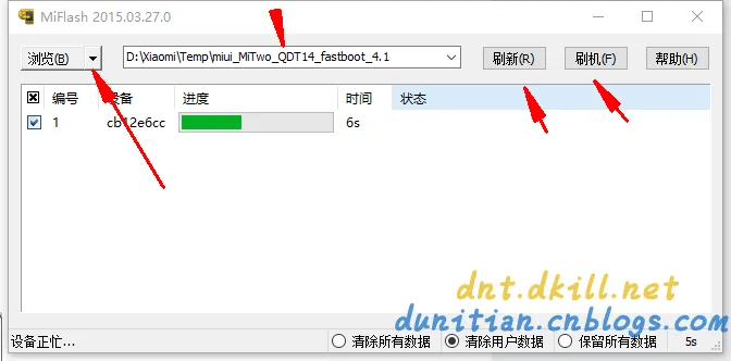 MiUi——MiTwo这个压缩包的解压地址放下面框里面(如果没有设备显示出来就按音量下键 + 电源键 进入FastBoot模式)
