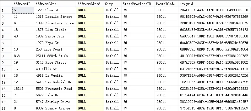 SELECT a.AddressID, a.AddressLine1, a.AddressLine2, a.City, a.StateProvinceID, a.PostalCode, a.rowguid
