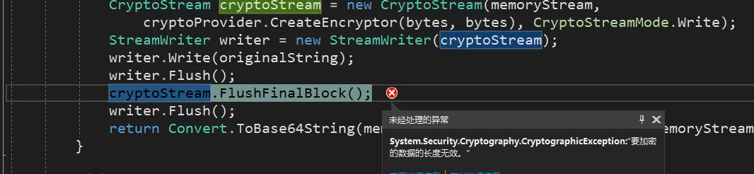 Padding = PaddingMode.None }; MemoryStream memoryStream = new MemoryStream(); CryptoStream cryptoStream = new CryptoStream(memoryStream, cryptoProvider.CreateEncryptor(bytes, bytes), CryptoStreamMode.Write); StreamWriter writer = new StreamWriter(cryptoStream); writer.Write(originalString); writer.Flush(); cryptoStream.FlushFinalBlock(); writer.Flush(); return Convert.ToBase64String(memoryStream.GetBuffer(), 0, (int)memoryStream.Length); }
