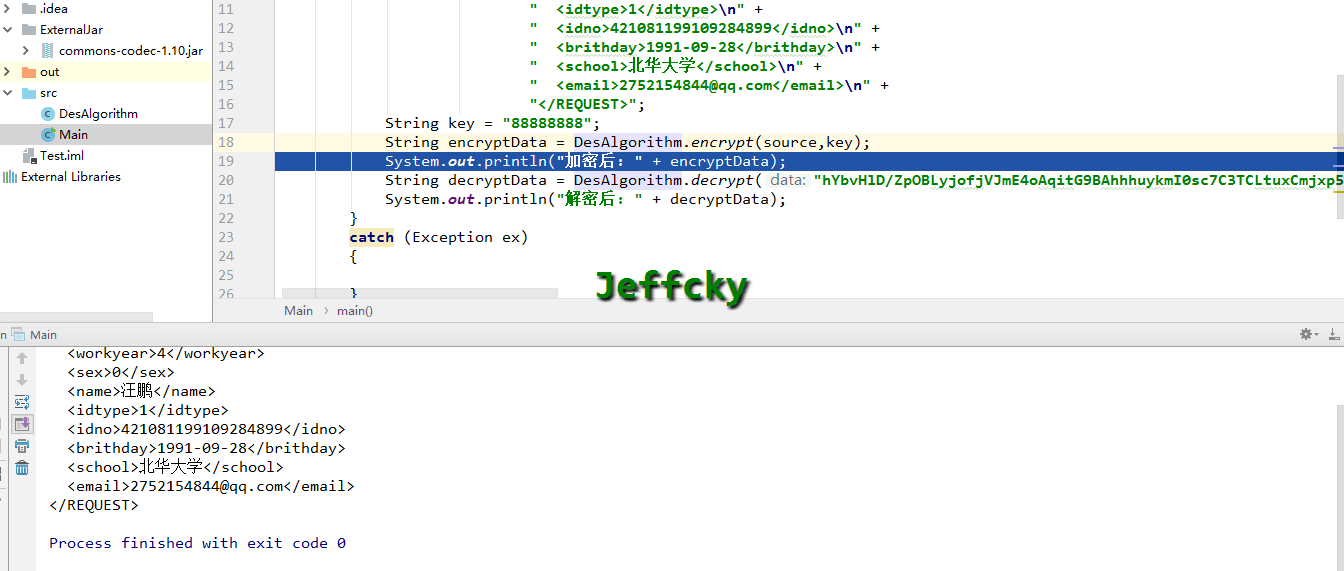 public class Main { public static void main(String[] args) { try { String source = "<?xml version=\"1.0\" encoding=\"GBK\"?>\n" + "<REQUEST>\n" + " <workyear>4</workyear>\n" + " <sex>0</sex>\n" + " <name>汪鹏</name>\n" + " <idtype>1</idtype>\n" + " <idno>421081199109284899</idno>\n" + " <brithday>1991-09-28</brithday>\n" + " <school>北华大学</school>\n" + " <email>2752154844@qq.com</email>\n" + "</REQUEST>"; String key = "88888888"; String encryptData = DesAlgorithm.encrypt(source,key); System.out.println("加密后: " + encryptData); String decryptData = DesAlgorithm.decrypt("hYbvHlD/ZpOBLyjofjVJmE4oAqitG9BAhhhuykmI0sc7C3TCLtuxCmjxp5WB+OXdEuwt1CqQxtLBCxpvsGbQUHw37J2LSABl+Zx4cM6Z8o5X4VdhTibUjryYkVPwYrzHgaiHA4VVDQ7P7RpMTsnFk372ZP1W+fr2UhpHC8hkohyBaOZ1NWOieQQvPvOLErhzcGWcmjUsnjp0vNEfM7y/FRsQhhvTKtRiPWPdRpWZGH+TofsSuhNtmcE61u0tgEhLcOpDvifLS9zGj2F7Jn8nR05Au7/uz5gl8jB6FCHc97YKAPR0jx69egA+MKfv6IYTmpSZSnWJGgFnnP4SpLGnH3+7Mm6uX8ni2sBaM0/9H9YpVgqpXJ2fCw==", key); System.out.println("解密后: " + decryptData); } catch (Exception ex) { } } }