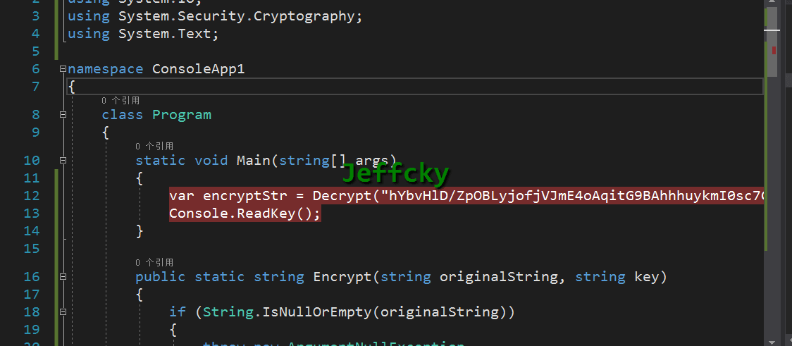 此时我们将加密后的数据利用.NET来进行解密,这里就有两个问题需要解决,一个是Java中ECB模式为不填充,第二个上述讲到Java中ECB加密时会对数据进行补位,且上述演示例子也是对数据进行了补位且用空字符串,所以在.NET中我们仍然需要加上ECB不填充且数据要补位和Java中一致,所以加密需要高修改为如下: