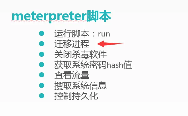 比如IE漏洞关闭了,则这个session就断了。所以,为了防止这种现象发生,利用IE漏洞拿到这个 Meterpreter 之后,我们会将它迁移到系统的一些稳定服务进程里面去。