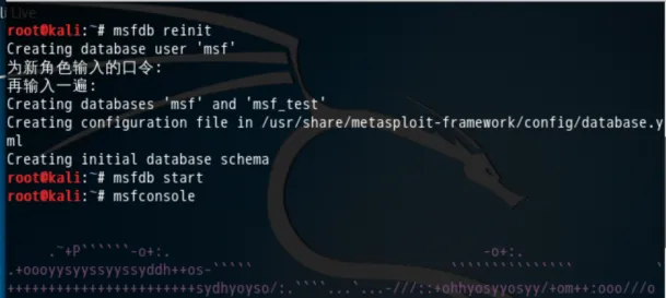 命令如下:msfdb init(默认创建的数据库名:msf,msf_test;用户名:msf;口令默认为空)