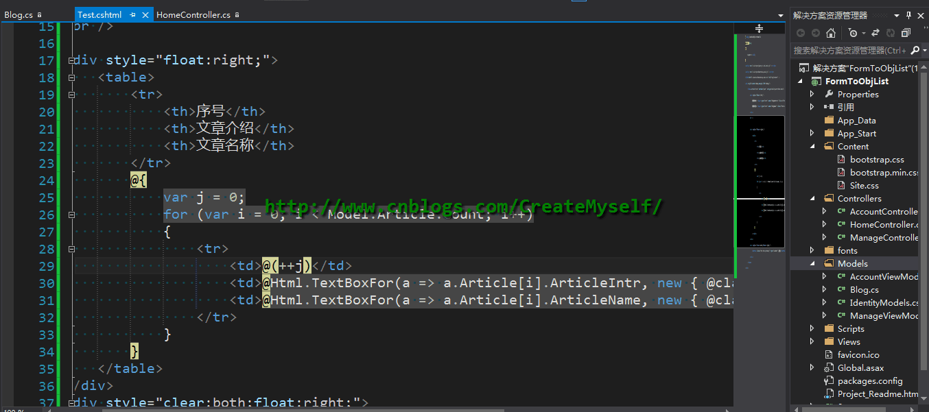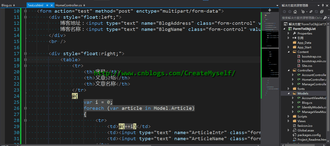 @using FormToObjList.Models @model Blog @{ Layout = null; } <script src="~/Scripts/jquery-1.10.2.min.js"></script> <script src="~/Scripts/bootstrap.min.js"></script> <link href="~/Content/bootstrap.min.css" rel="stylesheet" /> <div style="width:700px;margin-left:200px;"> <form action="test" method="post" enctype="multipart/form-data"> <div style="float:left;"> 博客地址:<input type="text" class="form-control" value="@Model.BlogAddress" /><br /> 博客名称:<input type="text" class="form-control" value="@Model.BlogName" /><br /> </div> <br /> <div style="float:right;"> <table> <tr> <th>序号</th> <th>文章介绍</th> <th>文章名称</th> </tr> @{ var i = 0; foreach (var article in Model.Article) { <tr> <td>@(++i)</td> <td><input type="text" class="form-control" value="@article.ArticleIntr" /></td> <td><input type="text" class="form-control" value="@article.ArticleName" /></td> </tr> } } </table> </div> <div style="clear:both;float:right;"> <button class="btn btn-primary" type="submit">提交</button> </div> </form> </div>