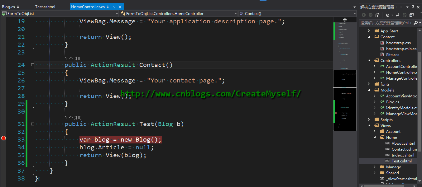 public ActionResult Test(Blog b) { var articleList = new List<Article>() { new Article() { ArticleIntr = "asp.net mvc", ArticleName = "mvc" }, new Article { ArticleIntr = "WebAPi", ArticleName = "WebAPi Authentication" } }; var blog = new Blog() { BlogName = "xpy0928", BlogAddress = "CreateMyself", Article = articleList }; return View(blog); }