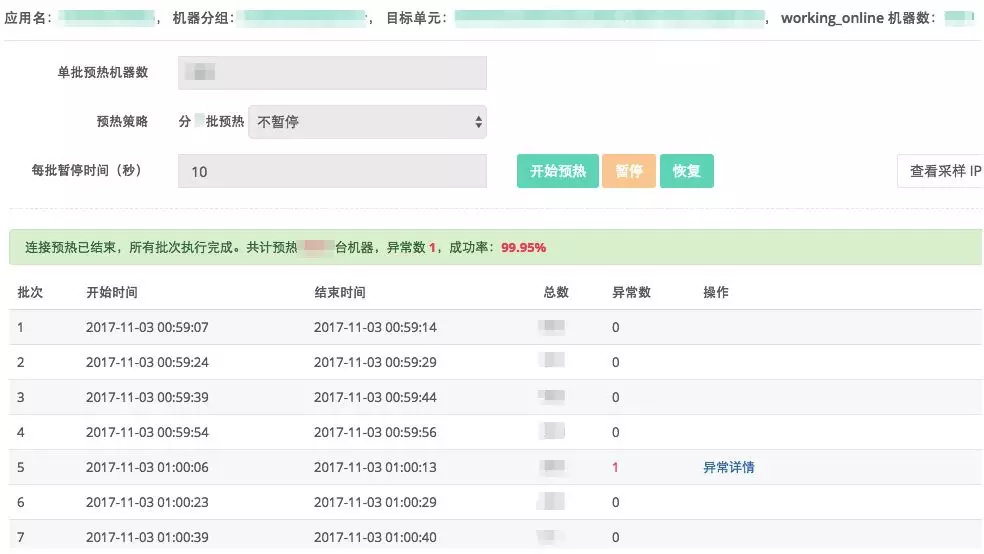 HSF服务治理平台的连接预热功能,支持指定应用、机器分组以及单元环境的预热,并且可以指定预热执行计划,并支持按预热批次暂停、恢复预热。在 2017 双 11 预热完成后,目标应用集合整体连接数增长大于50%,部分应用增长达 40 倍,符合连接预热的预期。