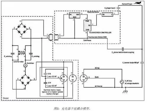 触摸屏干扰的另一个潜在来源是电源供电手机充电器的开关电源。干扰通过手指耦合到触摸屏上,如图5所示。小型手机充电器通常有交流电源火线和零线输入,但没有地线连接。充电器是安全隔离的,所以在电源输入和充电器次级线圈之间没有直流连接。然而,这仍然会通过开关电源隔离变压器产生电容耦合。充电器干扰通过手指触摸屏幕而形成返回路径。