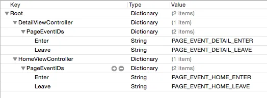 当然,我们可以有更优雅的方式,比如用一个配置表替代上面一长串的if判断,这样无论页面数怎么增加,代码始终是那么一小段。我们新建一个WGlobalUserStatisticsConfig.plist的配置表来存放每个页面在进入以及离开时的pageEventID,结构如下: