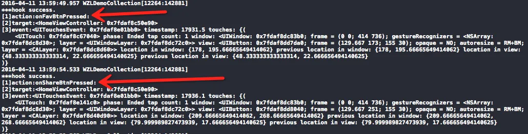 可以看到,通过category+method swizzling的方式在没有修改现有工程任何代码的情况下已经成功Hook到所有点击事件,在Hook代码中我们知道了一个点击事件的target也就是ViewController,也知道了点击事件的响应函数名,知道了点击的TouchSet。这些信息已经能满足埋点需求了。