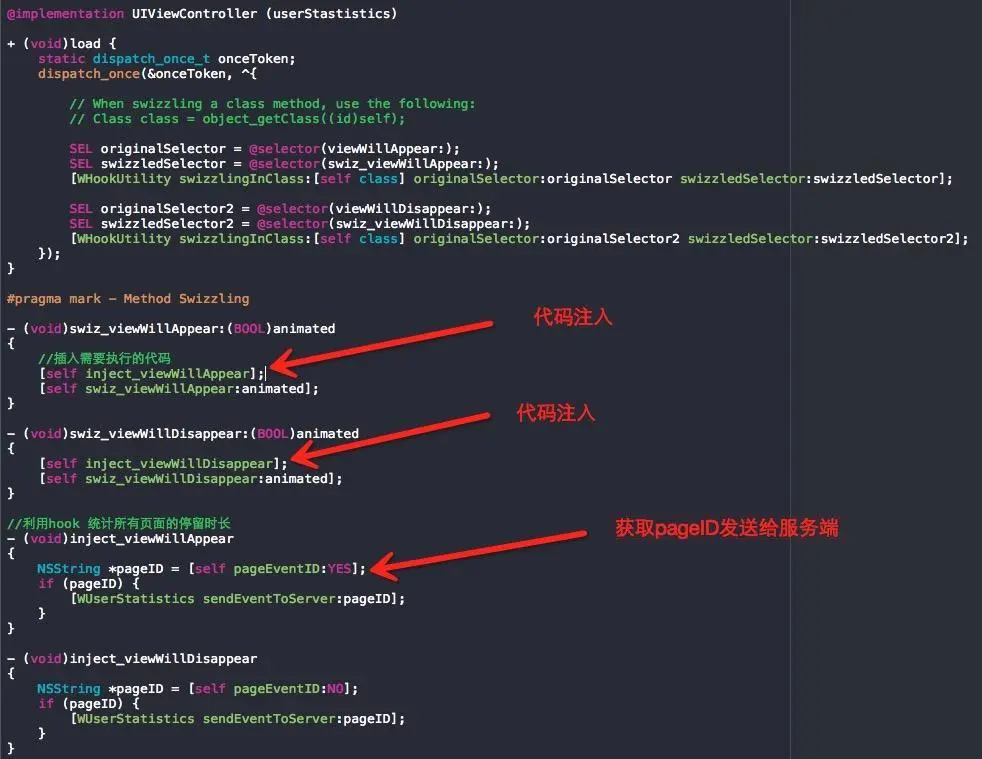 这部分应该比较直观了,摒弃掉在每个controller中埋点的方式,我们对UIViewController添加category从而Hook到viewWillAppear:与viewWillDisappear:。在这两个方法中注入埋点代码: