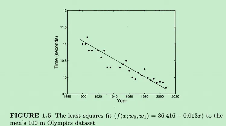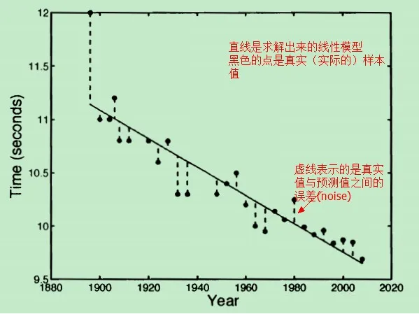 先来看一个线性模型的例子,奥林匹克百米赛跑的男子组历年数据如下: