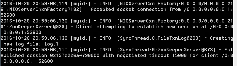 2016-10-20 20:59:06,177 [myid:] - INFO [main-SendThread(0:0:0:0:0:0:0:1:2181):ClientCnxn$SendThread@1299] - Session establishment complete on server 0:0:0:0:0:0:0:1/0:0:0:0:0:0:0:1:2181, sessionid = 0x157e226a4790000, negotiated timeout = 15000