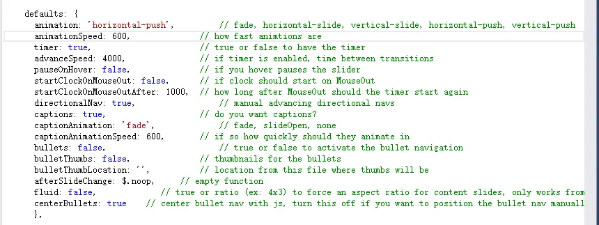 上述通过简单的代码就可以完成我们组件的初始化,其实初始化方法 $('#featured').orbit(); 并不是固定,它可以传入多个参数,实现不同的轮播效果。由于该组件文档并不是非常齐全,这些属性都是通过查看源码找到的,以下博主就根据自己的一些尝试和理解介绍一些常用的初始化属性。