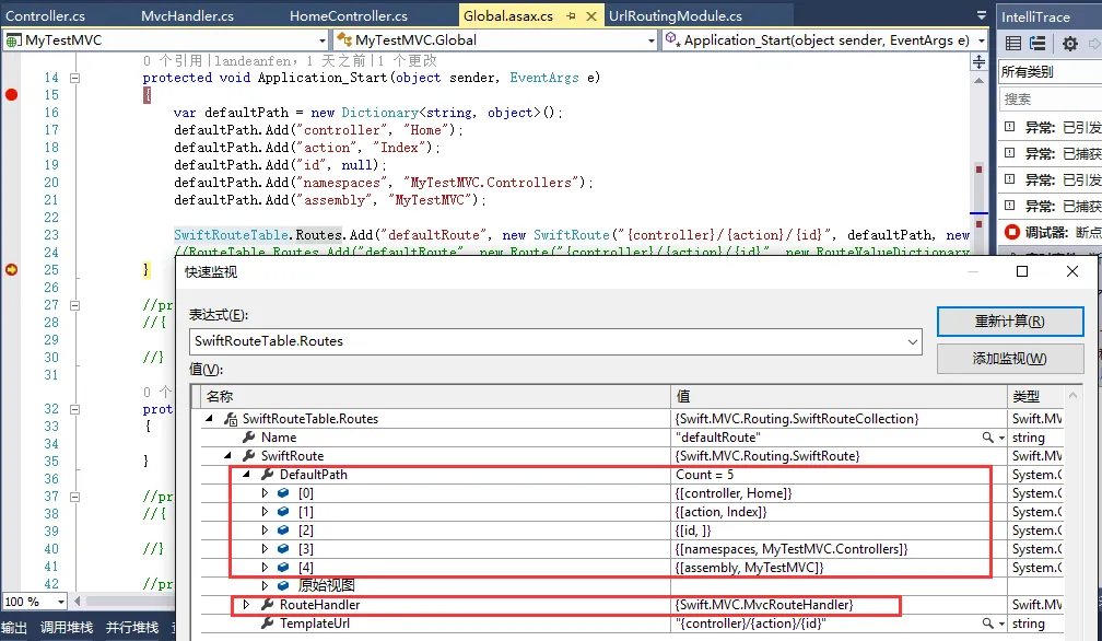 看到这里应该知道上文中 SwiftRouteTable 、 SwiftRouteCollection 、 SwiftRoute 三个类的用处了吧,原来在这里。IRouteHandler的实例new MvcRouteHandler()也是在这里写入的。
