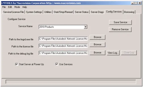 d. 选中"Start Server at Power Up"一遍在计算机启动时自动启动授权服务, 选中 "Use Services" 会创建一个你指定名字的windows服务。你可以通过开始->运行 services.msc打开服务管理器查看所有服务。