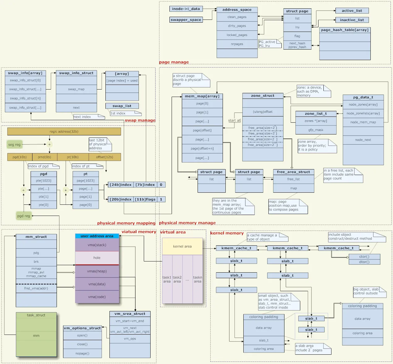每个内存介质维护了一个mem_map,为介质中的每一个物理页面建立了一个page结构与之对应,以便管理物理内存。