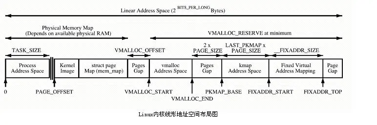 在x86结构中,Linux内核虚拟地址空间划分0~3G为用户空间,3~4G为内核空间(注意,内核可以使用的线性地址只有1G)。内核虚拟空间(3G~4G)又划分为三种类型的区: