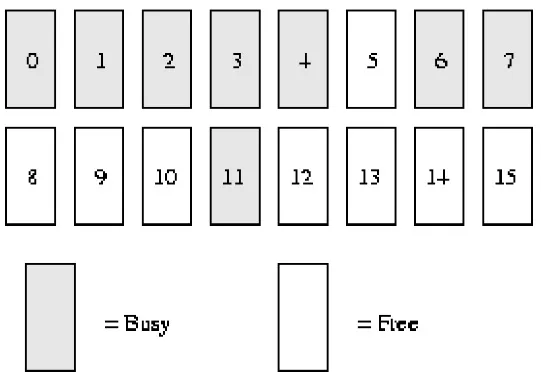 假设我们的系统内存只有16个页面RAM。因为RAM只有16个页面,我们只需用四个级别(orders)的伙伴位图(因为最大连续内存大小为16个页面),如下图所示。