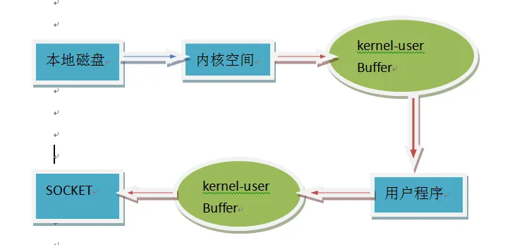 数据先从本地磁盘读取到内核空间中,再通过缓冲区由用户程序得到,用户程序再通过缓冲区将数据发送到Socket。