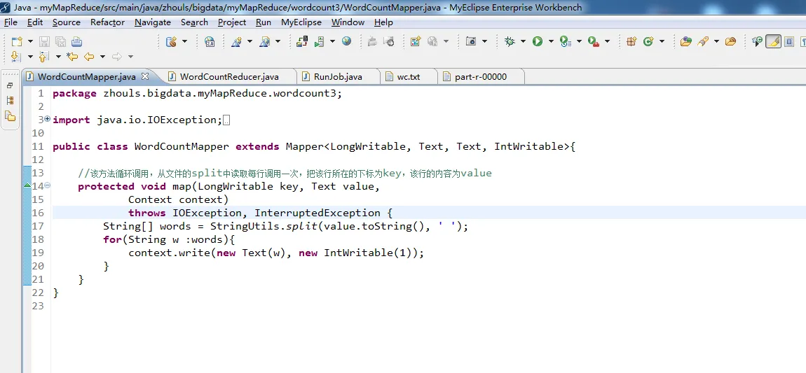 1 package zhouls.bigdata.myMapReduce.wordcount3; 2 3 import java.io.IOException; 4 5 import org.apache.hadoop.io.IntWritable; 6 import org.apache.hadoop.io.LongWritable; 7 import org.apache.hadoop.io.Text; 8 import org.apache.hadoop.mapreduce.Mapper; 9 import org.apache.hadoop.util.StringUtils; 10 11 public class WordCountMapper extends Mapper<LongWritable, Text, Text, IntWritable>{ 12 13 //该方法循环调用,从文件的split中读取每行调用一次,把该行所在的下标为key,该行的内容为value 14 protected void map(LongWritable key, Text value, 15 Context context) 16 throws IOException, InterruptedException { 17 String[] words = StringUtils.split(value.toString(), ' '); 18 for(String w :words){ 19 context.write(new Text(w), new IntWritable(1)); 20 } 21 } 22 }