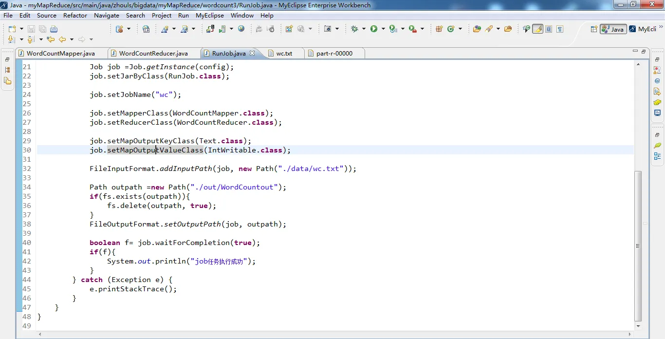 1 package zhouls.bigdata.myMapReduce.wordcount3; 2 3 4 import org.apache.hadoop.conf.Configuration; 5 import org.apache.hadoop.fs.FileSystem; 6 import org.apache.hadoop.fs.Path; 7 import org.apache.hadoop.io.IntWritable; 8 import org.apache.hadoop.io.Text; 9 import org.apache.hadoop.mapreduce.Job; 10 import org.apache.hadoop.mapreduce.lib.input.FileInputFormat; 11 import org.apache.hadoop.mapreduce.lib.output.FileOutputFormat; 12 13 public class RunJob { 14 15 public static void main(String[] args) { 16 Configuration config =new Configuration(); 17 18 try { 19 FileSystem fs =FileSystem.get(config); 20 21 Job job =Job.getInstance(config); 22 job.setJarByClass(RunJob.class); 23 24 job.setJobName("wc"); 25 26 job.setMapperClass(WordCountMapper.class); 27 job.setReducerClass(WordCountReducer.class); 28 29 job.setMapOutputKeyClass(Text.class); 30 job.setMapOutputValueClass(IntWritable.class); 31 32 FileInputFormat.addInputPath(job, new Path("./data/wc.txt")); 33 34 Path outpath =new Path("./out/WordCountout"); 35 if(fs.exists(outpath)){ 36 fs.delete(outpath, true); 37 } 38 FileOutputFormat.setOutputPath(job, outpath); 39 40 boolean f= job.waitForCompletion(true); 41 if(f){ 42 System.out.println("job任务执行成功"); 43 } 44 } catch (Exception e) { 45 e.printStackTrace(); 46 } 47 } 48 }