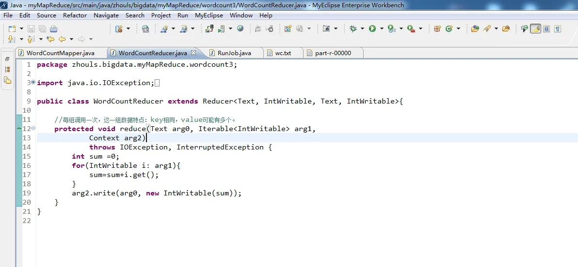 1 package zhouls.bigdata.myMapReduce.wordcount3; 2 3 import java.io.IOException; 4 5 import org.apache.hadoop.io.IntWritable; 6 import org.apache.hadoop.io.Text; 7 import org.apache.hadoop.mapreduce.Reducer; 8 9 public class WordCountReducer extends Reducer<Text, IntWritable, Text, IntWritable>{ 10 11 //每组调用一次,这一组数据特点:key相同,value可能有多个。 12 protected void reduce(Text arg0, Iterable<IntWritable> arg1, 13 Context arg2) 14 throws IOException, InterruptedException { 15 int sum =0; 16 for(IntWritable i: arg1){ 17 sum=sum+i.get(); 18 } 19 arg2.write(arg0, new IntWritable(sum)); 20 } 21 }