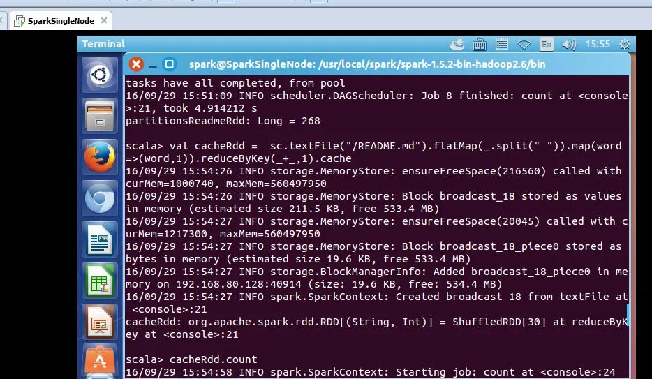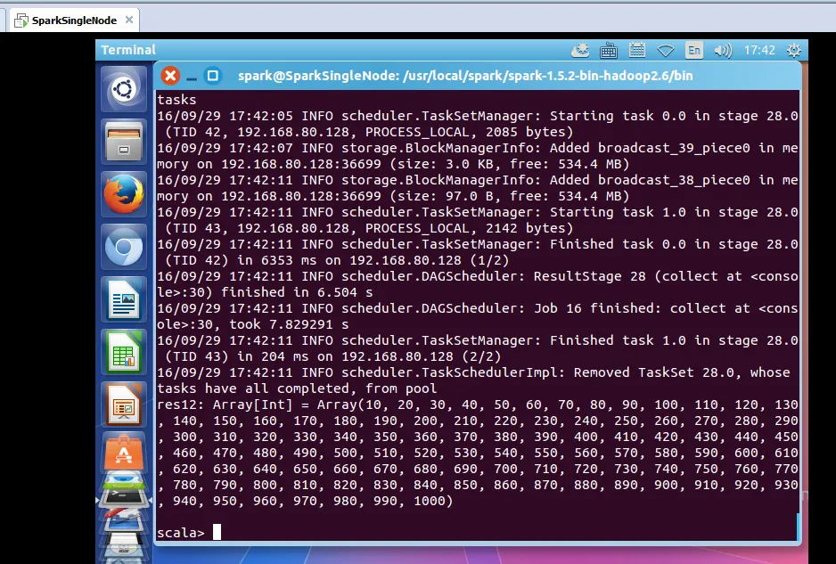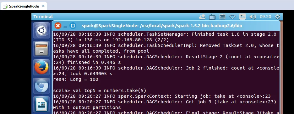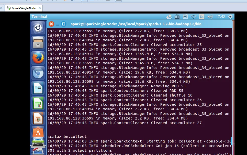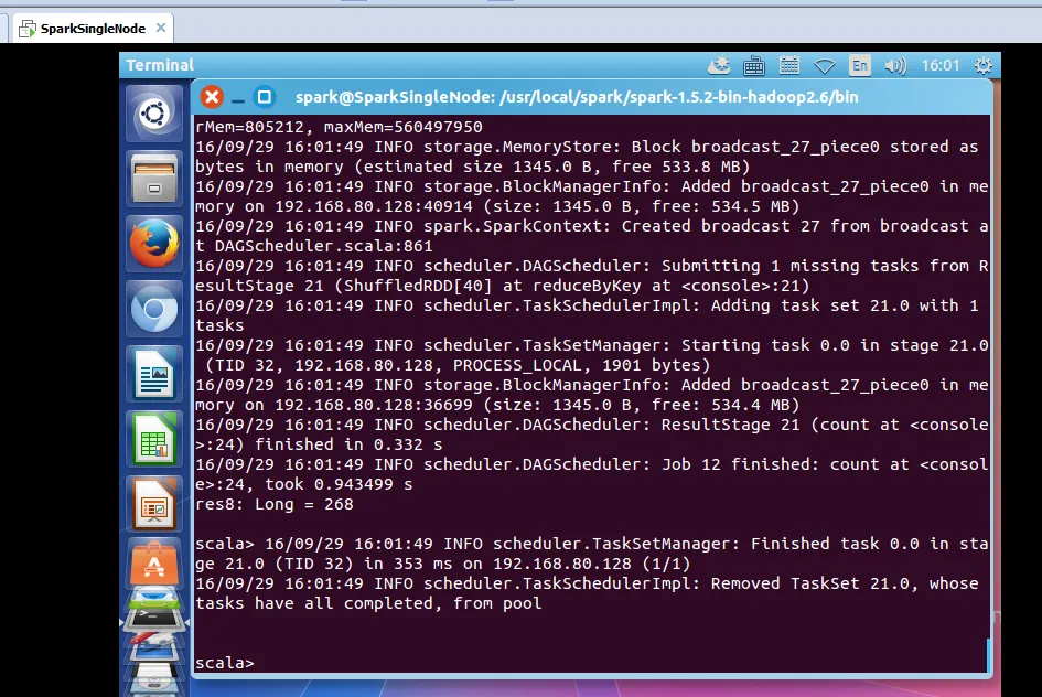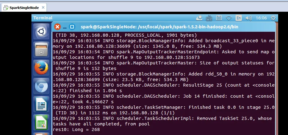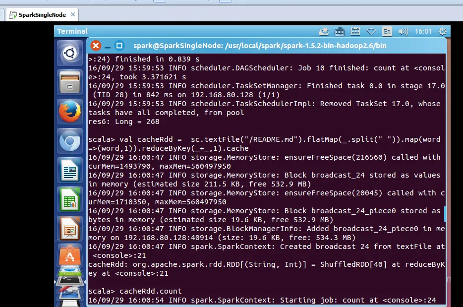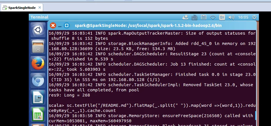 spark@SparkSingleNode:/usr/local/spark/spark-1.5.2-bin-hadoop2.6/bin$ ./spark-shell --master spark://SparkSingleNode:7077 --executor-memory 1g