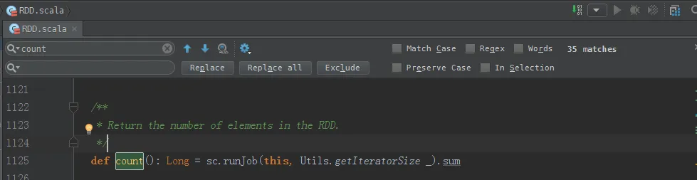 def count(): Long = sc.runJob(this, Utils.getIteratorSize _).sum