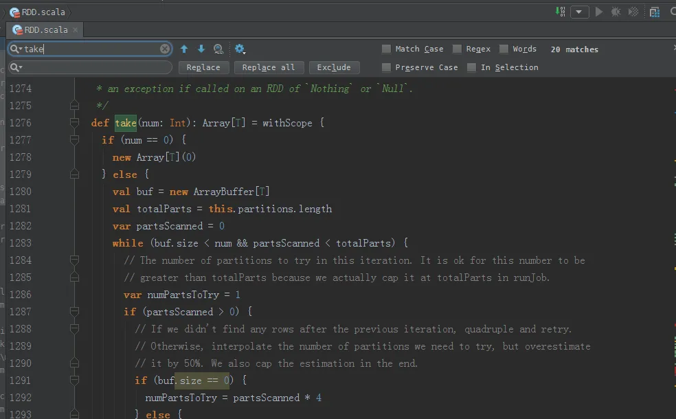 * Take the first num elements of the RDD. It works by first scanning one partition, and use the