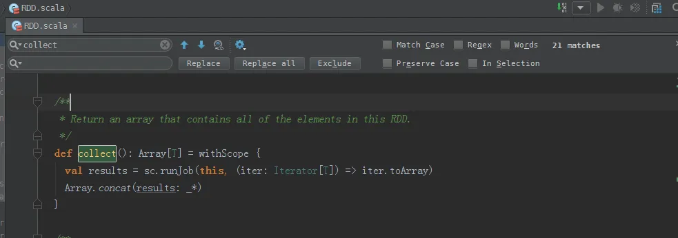 val results = sc.runJob(this, (iter: Iterator[T]) => iter.toArray)