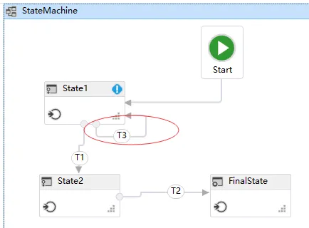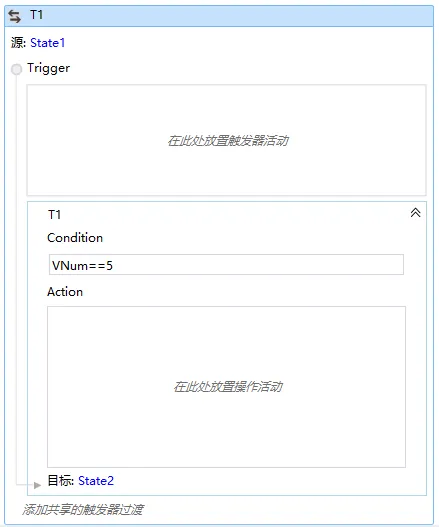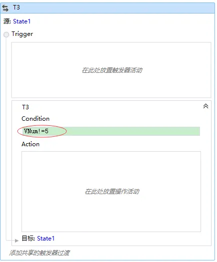 7、添加T3,当VNum变量的值不等于5,再回到State1。