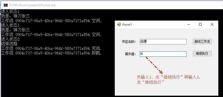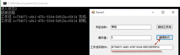 //唤醒BookMark执行流程 private void btnContinue_Click(object sender, EventArgs e) { //这里会调用PreExecuteWorkFlow方法,并将txtNum的值传过去 app.ResumeBookmark(txtBookMarkName.Text, int.Parse(txtNum.Text)); }