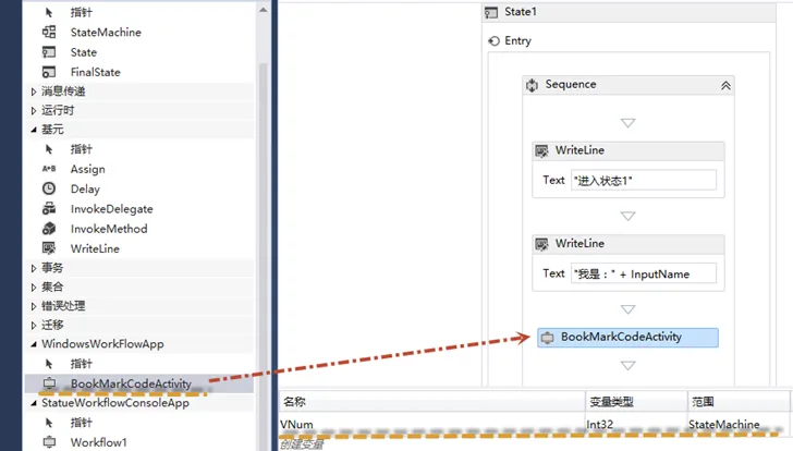 3、双击State1打开,将代码活动添加到State1中,并创建变量Vnum。