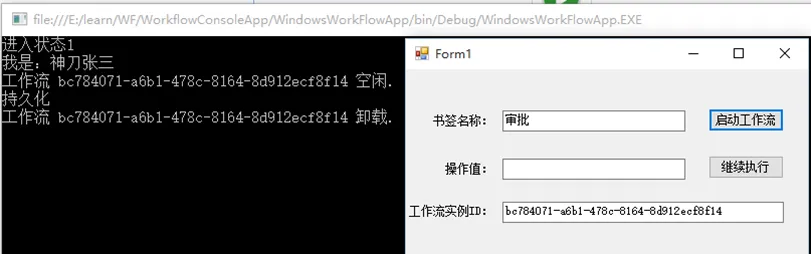 app = new WorkflowApplication(new Activity1(), new Dictionary<string, object>() { {"InputName","神刀张三"},{"InputBookMarkName",txtBookMarkName.Text} }); app.Idle = delegate(WorkflowApplicationIdleEventArgs er) { Console.WriteLine("工作流 {0} 空闲.", er.InstanceId); syncEvent.Set(); //这里要唤醒,不让的话,当创建了一个书签之后,界面就卡死了。 };