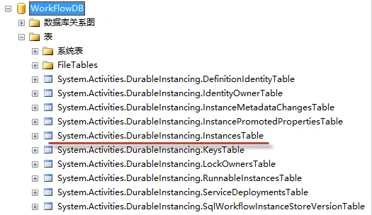 找到这两个SQL脚本之后,在数据库WorkFlowDB中首先运行 SqlWorkflowInstanceStoreSchema.sql 文件,然后运行 SqlWorkflowInstanceStoreLogic.sql 文件。执行完成之后,就会在数据库WorkFlowDB中新建如下表。